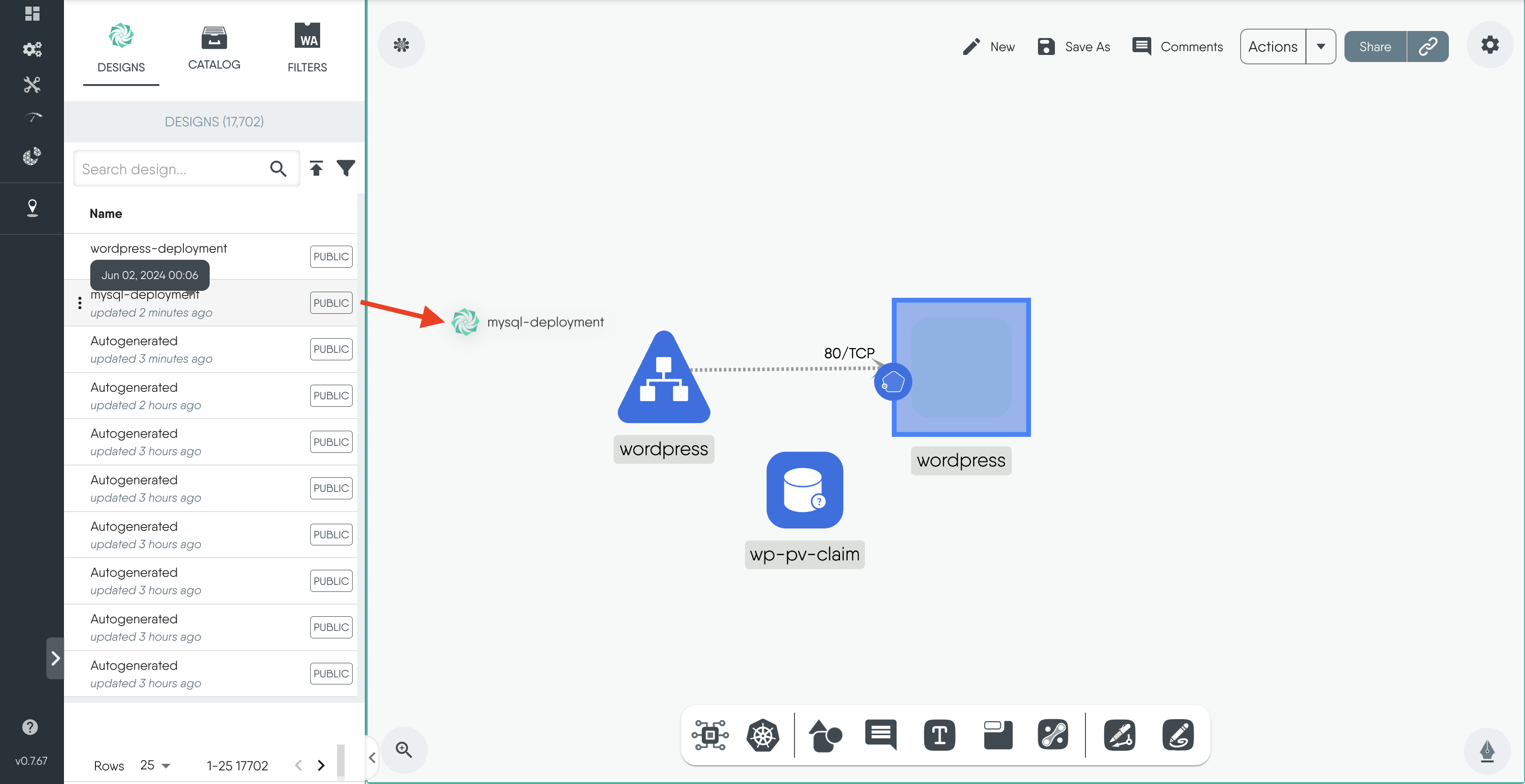 Clicking on the names of the designs on the Designs tab displays the visual representations of the various Kubernetes resources and their relationships on the canvas.